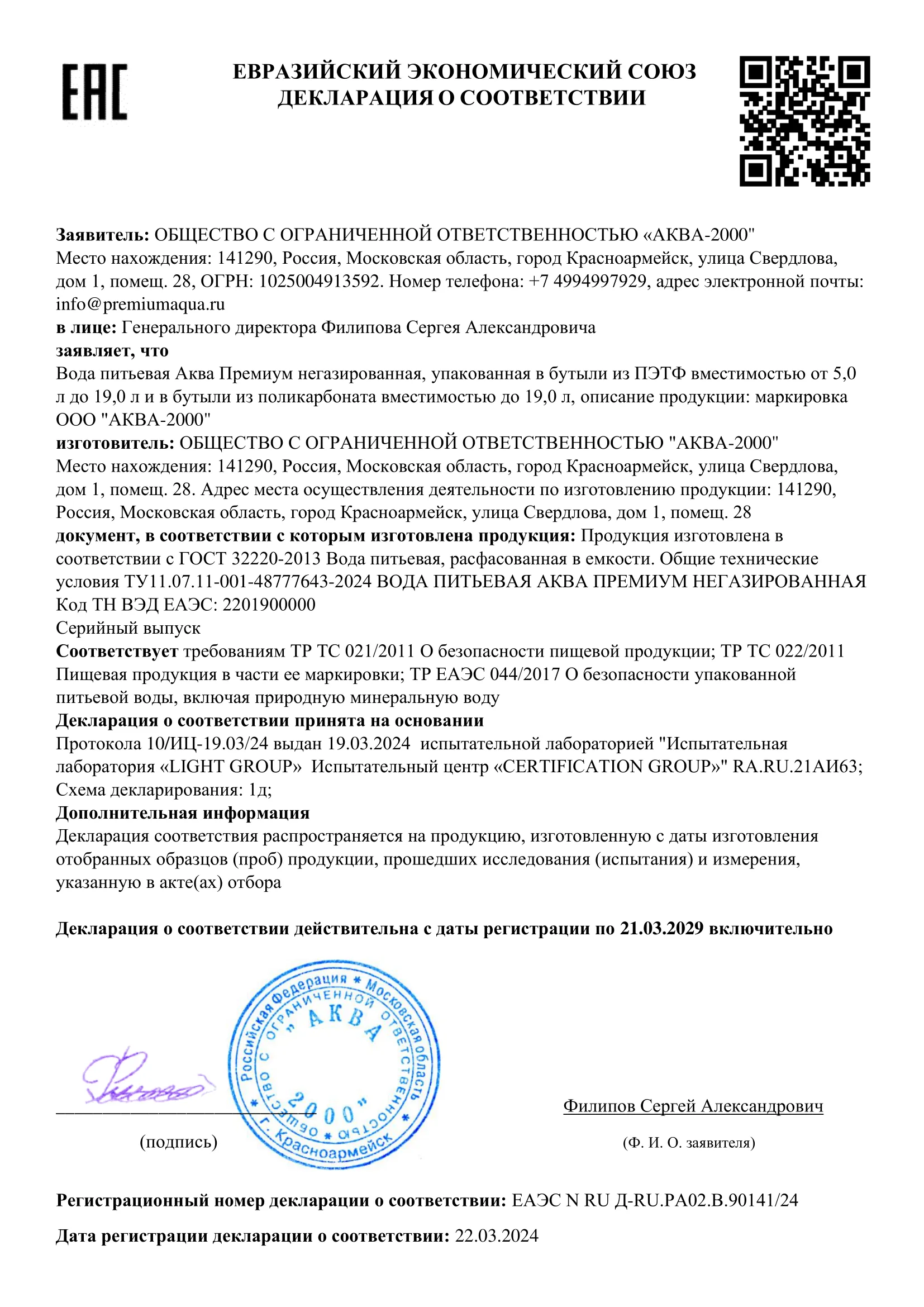 Декларация соответствия для питьевой воды Аква Премиум – документ, подтверждающий соответствие продукции требованиям качества и безопасности, установленными для нее действующими стандартами и правилами (ГОСТ, ГОСТ Р, ГОСТ Р МЭК, ТУ, Технический регламент и пр.). Публичная ссылка на единый реестр сертификатов соответствия и деклараций о соответствии ФГИС РОСАККРЕДИТАЦИИ: Декларация о соответствии
